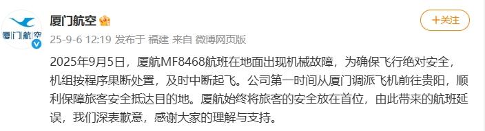 2025年9月5日,厦航MF8468航班在地面出现机械故障,为确保飞行绝对安全,机组按程序果断处置,及时中断起飞。公司第一时间从厦门调派飞机前往贵阳,顺利保障旅客安全抵达目的地。厦航始终将旅客的安全放在首位,由此带来的航班延误,我们深表歉意,感谢大家的理解与支持。