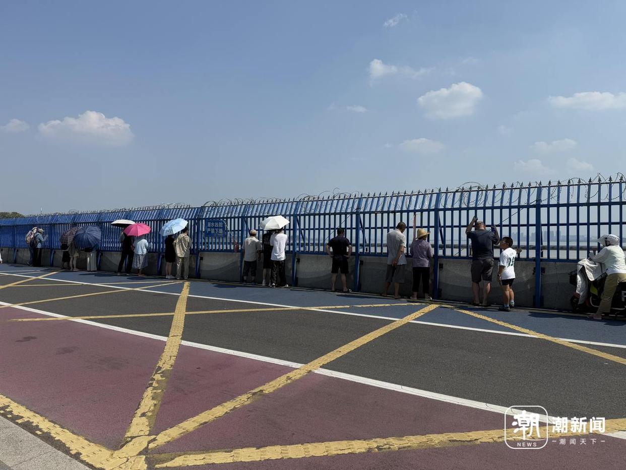 2025年9月6日,农历七月十五,正午的阳光直射在钱塘江七格猪头角坝的石堤上。四五十名观潮者稀疏地分布在杭州红驿·猪头角驿站门口阴凉处,等待着传说中的“鬼王潮”。