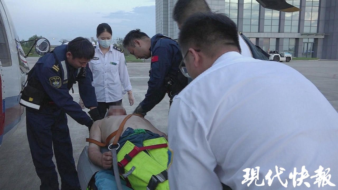傍晚6点20分左右,救助直升机在射阳通用机场降落,早已等候在机场的医护人员迅速将晕倒渔民接转到担架车上,推送上救护车送往医院抢救治疗。据晕倒渔民的同事介绍,当时因为气温太高,渔民在捕捞作业过程中,疑因中暑而晕倒昏迷,在船上休息一段时间后未见好转,于是报警求助。