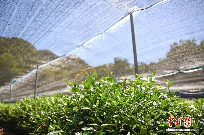 为应对近期的持续性高温,杭州西湖龙井茶核心产区内,茶农利用遮阳网保护龙井茶。王刚摄