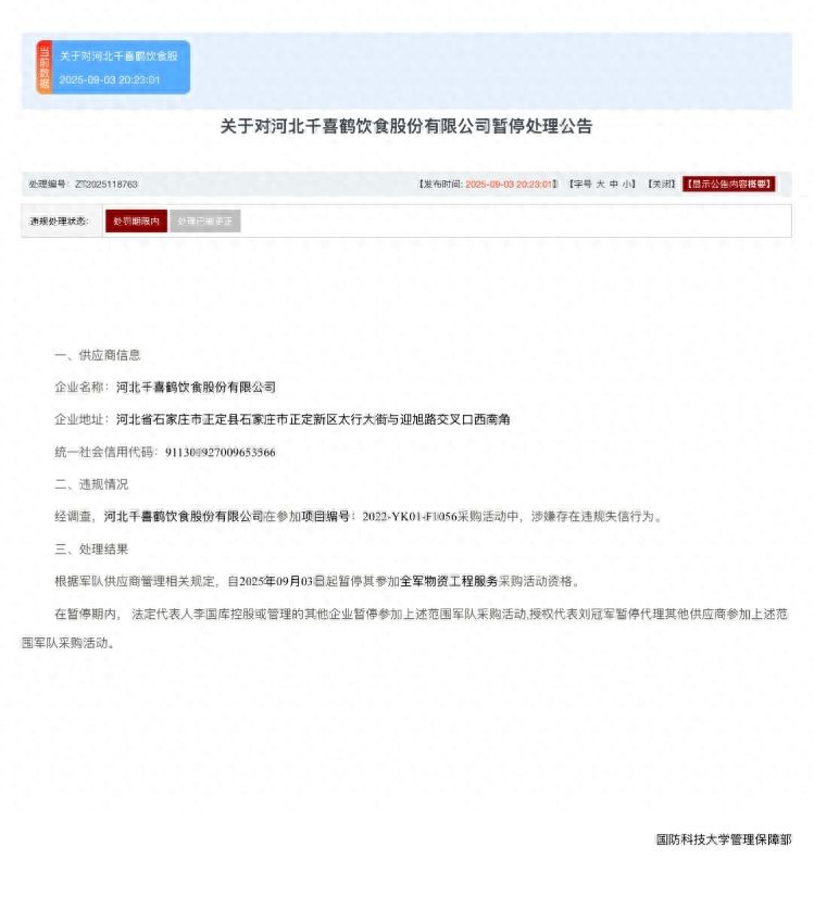 近日,国防科技大学管理保障部发布公告,河北千喜鹤饮食股份有限公司因涉嫌串通投标,自9月3日起暂停其参加全军物资工程服务采购活动资格。