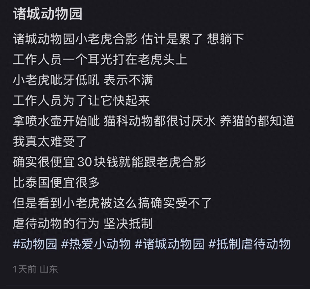 发帖网友在帖子中表示,和小老虎拍照的价格为30元/次,“确实很便宜30块钱就能和老虎合影,但是看到小老虎被这么搞确实受不了。”该帖引发网友热议,众网友纷纷表示,“真的看不下去,坚决抵制虐待动物的行为。”