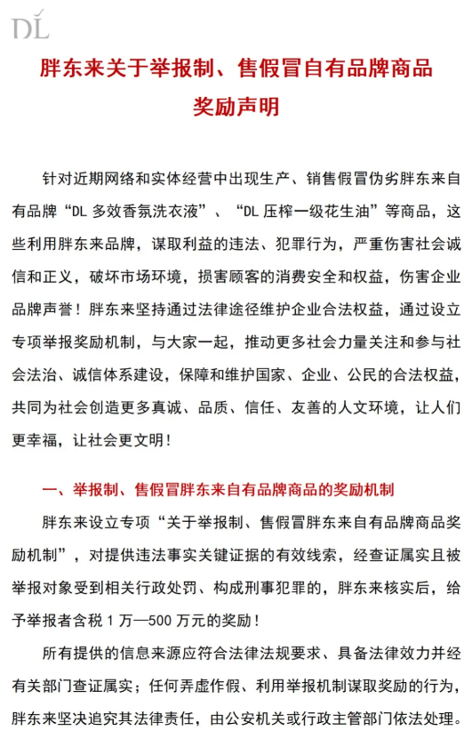 9月1日,胖东来发布声明,设立专项“关于举报制、售假冒胖东来自有品牌商品奖励机制”,对提供违法事实关键证据的有效线索,经查证属实且被举报对象受到相关行政处罚、构成刑事犯罪的,经核实后,给予举报者最高500万元的奖励。