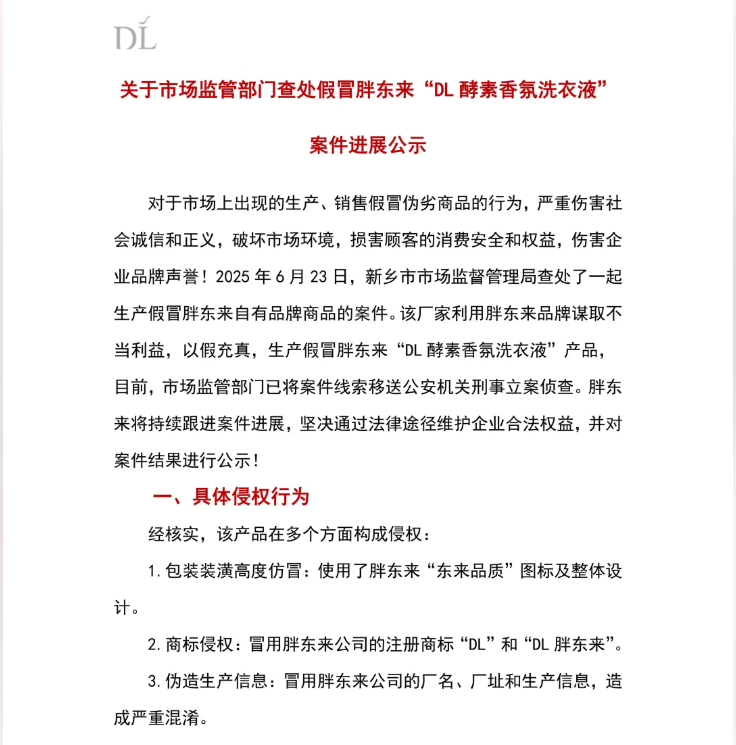 9月8日,胖东来发布了《关于市场监管部门查处假冒胖东来“DL酵素香氛洗衣液”案件进展公示》。公示显示,2025年6月23日,新乡市市场监督管理局查处了一起生产假冒胖东来自有品牌商品的案件。涉事厂家利用胖东来品牌谋取不当利益,以假充真,生产假冒胖东来“DL酵素香氛洗衣液”产品。具体侵权行为包括仿冒胖东来包装装潢、冒用注册商标“DL”和“DL胖东来”,以及伪造胖东来厂名、厂址等生产信息。目前,市场监管部门已将案件线索移送公安机关刑事立案侦查。