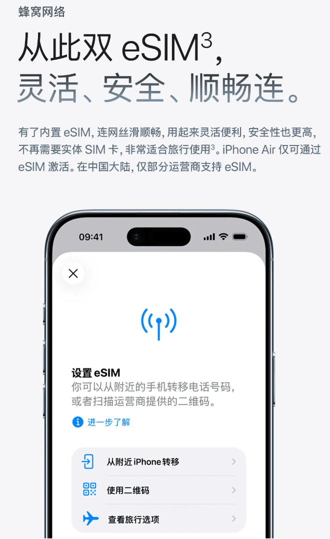 北京时间9月10日凌晨,苹果正式发布iPhone Air,这也是史上最薄的iPhone,薄至5.6毫米。苹果方面表示,iPhone Air采用eSIM设计以节省内部空间。