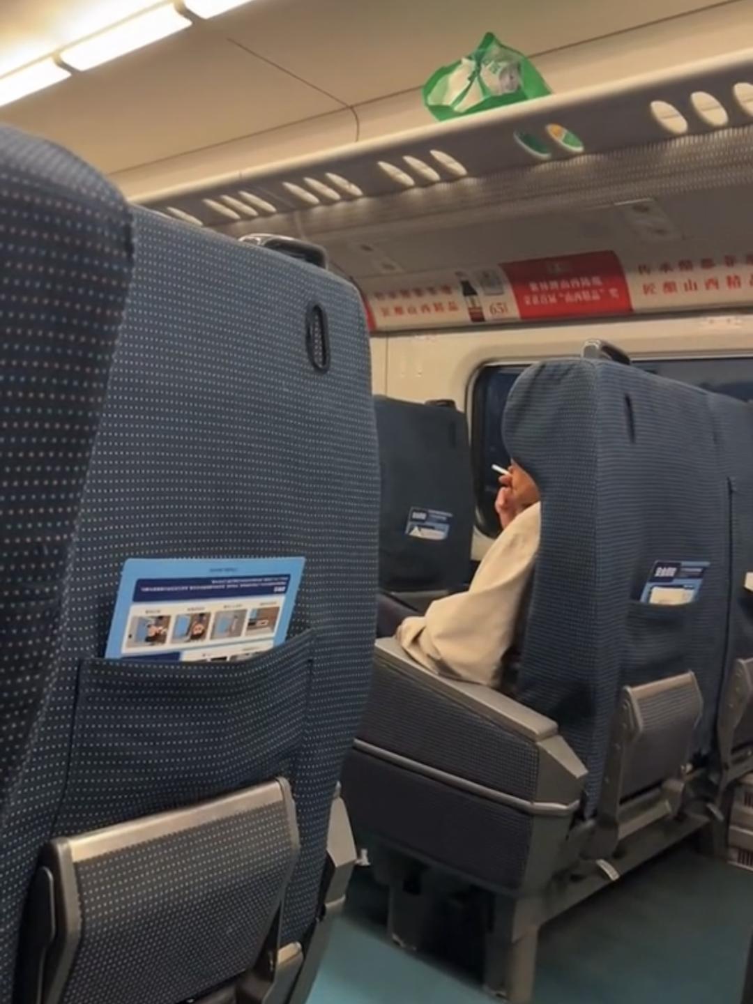 近日的一段网传视频显示,在一列运行中的高铁车厢内,一名身穿浅色衬衣的男子坐在座位上吸烟,吐出烟雾。车厢内的宣传标识显示,该趟列车疑似是在山西运行的车次。