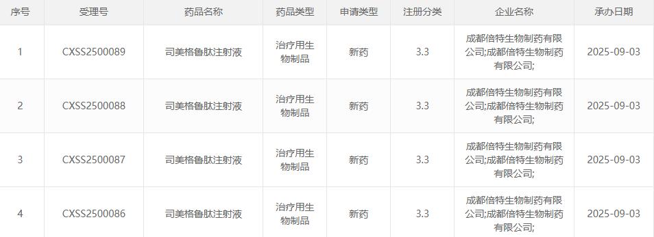 红星资本局在国家药品监督管理局药品审评中心(CDE)官网看到,截至目前,国内已有近30款司美格鲁肽注射液进入到了临床阶段,分别来自九源基因(02566.HK)、倍特药业、丽珠集团(000513.SZ)、华东医药(000963.SZ)、齐鲁制药、联邦制药(03933.HK)、惠升生物以及石药集团(01093.HK)这8家公司。其中,倍特药业的司美格鲁肽注射液上市申请于9月3日获得国家药审中心受理。