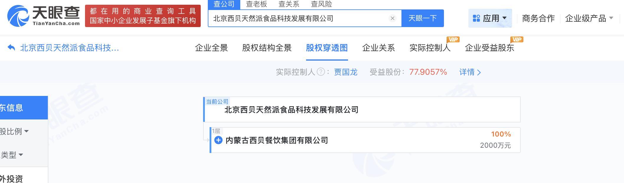 上述两袋食品的生产企业名为北京西贝天然派食品科技发展有限公司。天眼查显示,该企业成立日期为2017年8月18日,注册地为北京市平谷区农业中关村现代食品营养谷,由内蒙古西贝餐饮集团有限公司持股100%。