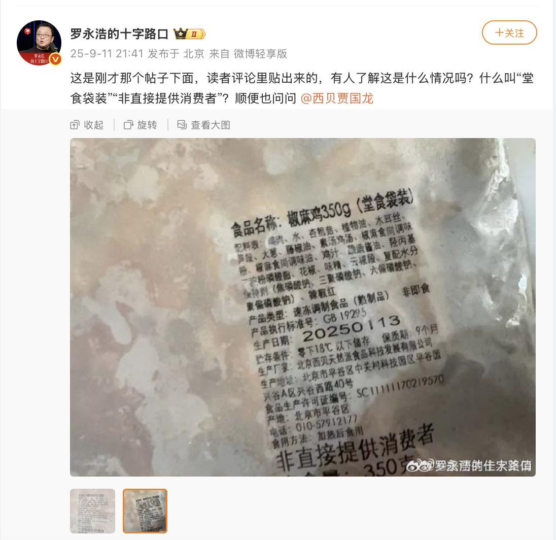 “什么叫‘堂食袋装’‘非直接提供消费者’?顺便也问问@西贝贾国龙。”9月11日晚,网络名人罗永浩再度晒出两袋由西贝旗下企业生产的食品,外包装显示分别为“小牛焖饭牛肉包2.5kg”“椒麻鸡350g”,喊话西贝回应预制菜争议。12日上午,极目新闻记者向西贝方面咨询这两袋食品是否为预制菜,供应给哪些渠道,截至发稿,暂未获回复。