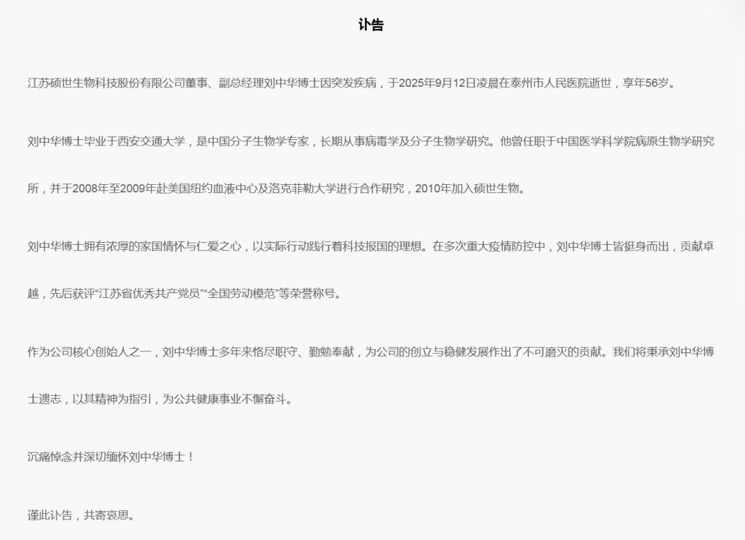 9月12日,硕世生物在官网发布讣告称,公司董事、副总经理刘中华因突发疾病,于2025年9月12日凌晨在泰州市人民医院逝世,享年56岁。公司及全体员工对此表示深切哀悼,并向其家属致以诚挚的慰问。