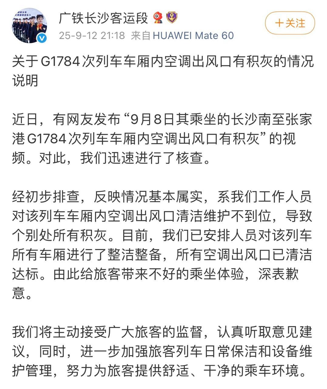 近日,有网友发布“9月8日其乘坐的长沙南至张家港G1784次列车车厢内空调出风口有积灰”的视频。9月12日晚9时许,广铁长沙客运段对这一情况进行了核查,并发布回应。