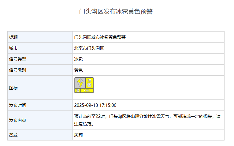 北京门头沟区发布冰雹黄色预警:可能造成一定损失,请注意防范