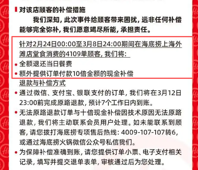 海底捞对消费者“退一赔十”。海底捞官方微博截图