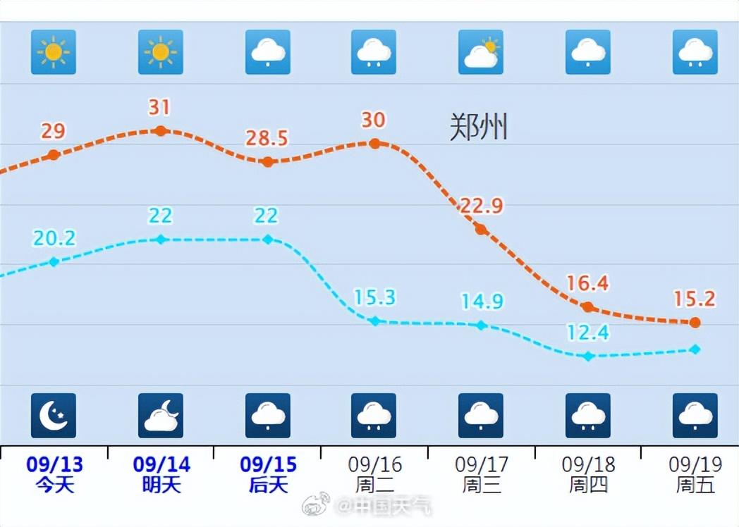 省会郑州的天气变化也将印证这一过程。14日,郑州以晴天间多云为主,最高气温29℃。15日转为阴天,有中阵雨、雷阵雨,局部大雨。16日,阴雨持续,有中到大雨,夜里还将出现4级左右的偏北风,阵风6到7级。