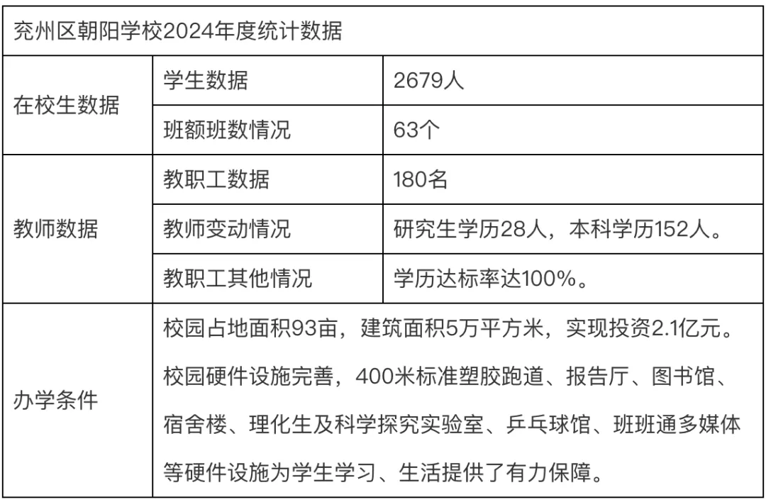 朝阳学校为山东济宁兖州区的一所九年一贯制民办学校,亦是兖州区委区政府2018年招商引资的重大民生工程。根据2024年的统计数据,兖州区朝阳学校有63个教学班,在校学生2679人,教职工180人。