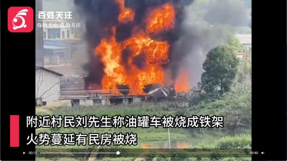 附近村民刘先生称油罐车被烧成铁架,火势蔓延有民房被烧。