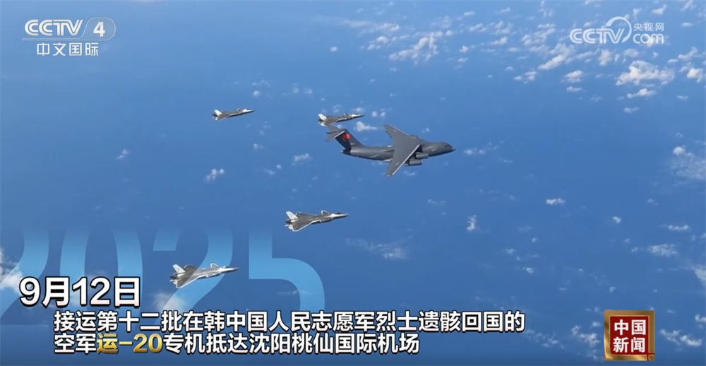 9月12日,第十二批在韩志愿军烈士遗骸,由一架运-20军用大型运输机接运回国。这架运-20也在纪念中国人民抗日战争暨世界反法西斯战争胜利80周年阅兵中接受了检阅。