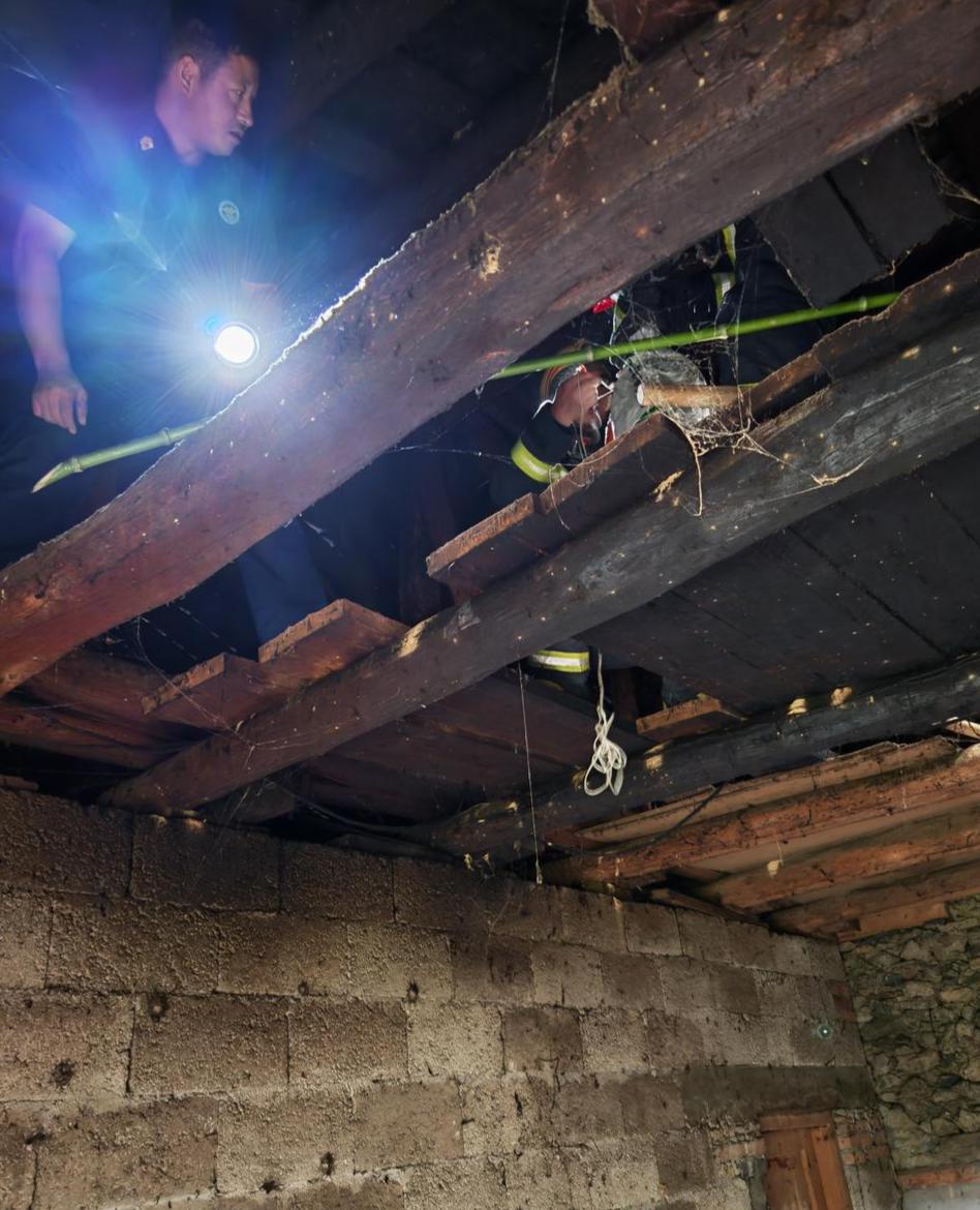冕宁县消防救援局接警后,迅速携带专业设备赶赴现场。经勘查,该蛇体型较长,盘踞位置复杂,抓捕难度极大。救援人员全副武装,在狭窄楼层间谨慎作业,最终成功锁定蛇头位置并实施抓捕。蛇在剧烈挣扎中咬住了救援者的手套并喷出毒液,因防护到位,救援人员未受伤。