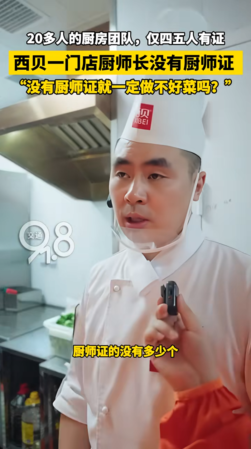 该门店后厨厨师长接受了记者的采访。被问及是否有厨师证时,这名厨师长告诉记者:“后厨团队有20多人,有厨师证大概有四五个。我自己是没有厨师证。在我们这里,有没有厨师证并不是必须的。在我看来,有证和没证对做菜水平并没有绝对的影响。我们选人最看重的是态度——愿意学、愿意干。不怕你不会,就怕你不愿意学。没有厨师证就一定做不好菜吗?”他表示,自己是在西贝逐步学习成长起来的,至今已在西贝工作了十年。记者了解到,该门店后厨人员均持有健康证。
