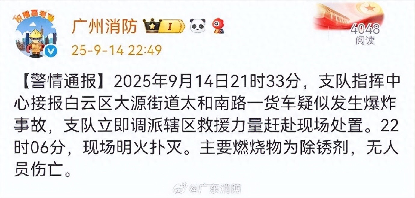 2025年9月14日21时33分,广州市消防救援支队指挥中心接报白云区大源街道太和南路一货车疑似发生爆炸事故,广州支队立即调派辖区救援力量赶赴现场处置。22时06分,现场明火扑灭。主要燃烧物为除锈剂,无人员伤亡。