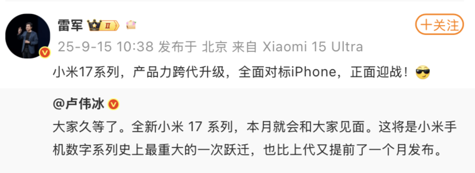 9月15日,小米集团董事长兼CEO雷军通过个人微博表示,小米17系列产品力将跨代升级,全面对标iPhone,正面迎战!