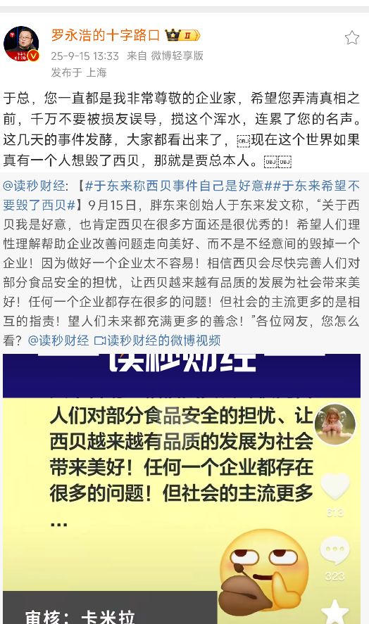 同日,罗永浩对此回应称:“于总,您一直都是我非常尊敬的企业家,希望您弄清真相之前,千万不要被损友误导,搅这个浑水,连累了您的名声。这几天的事件发酵,大家都看出来了,现在这个世界如果真有一个人想毁了西贝,那就是贾总本人。”