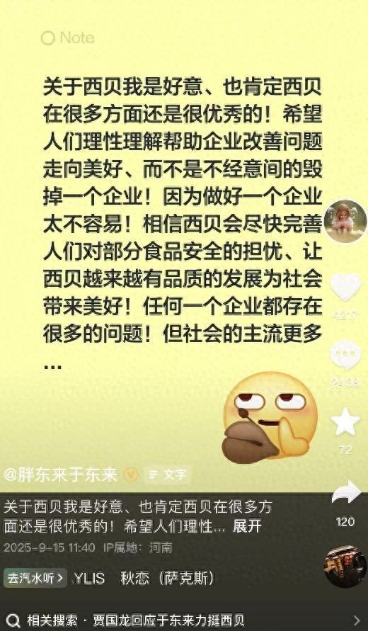 9月15日上午,胖东来集团创始人于东来再次公开发声支持西贝。他表示:“关于西贝我是好意、也肯定西贝在很多方面还是很优秀的!希望人们理性理解帮助企业改善问题走向美好、而不是不经意间的毁掉一个企业!因为做好一个企业太不容易!相信西贝会尽快完善人们对部分食品安全的担忧、让西贝越来越有品质的发展为社会带来美好!任何一个企业都存在很多的问题!但社会的主流更多是相互的指责!望人们未来都充满更多的善念!”