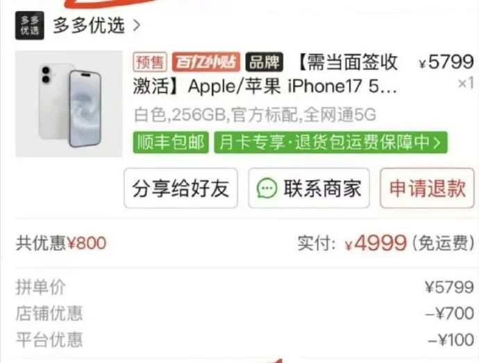 更有网友晒单显示,iPhone 17 256GB叠加更多优惠券后成交价4999元。