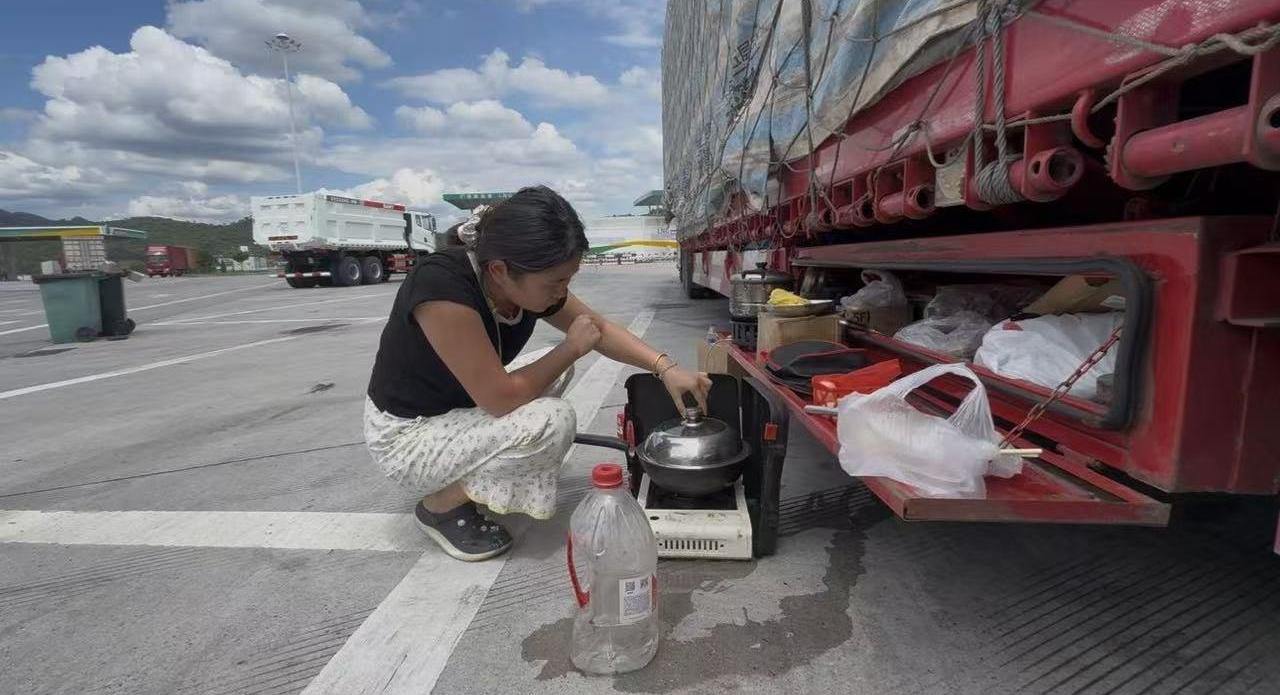 驾驶座后面是高低铺,夫妻俩吃住都在车上,饿了就拿车上的工具箱当餐桌,吃个泡面应付一下。到了服务区条件会好一点,可以生火做饭,还可以洗漱和换洗衣服。