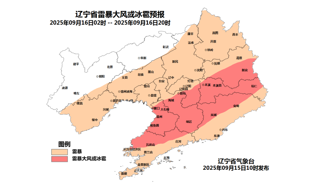 预计9月16日2时到16日20时,沈阳、大连、鞍山、抚顺、本溪、丹东、营口、辽阳、铁岭、盘锦地区和沈抚示范区有雷电、大风、冰雹、短时强降水等强对流天气,雷雨时最大风力8~10级,最大小时雨强20~40毫米,平均降水量为小雨到中雨(5~20毫米),局部有大雨(25~50毫米);其他地区有阵雨或雷阵雨。
