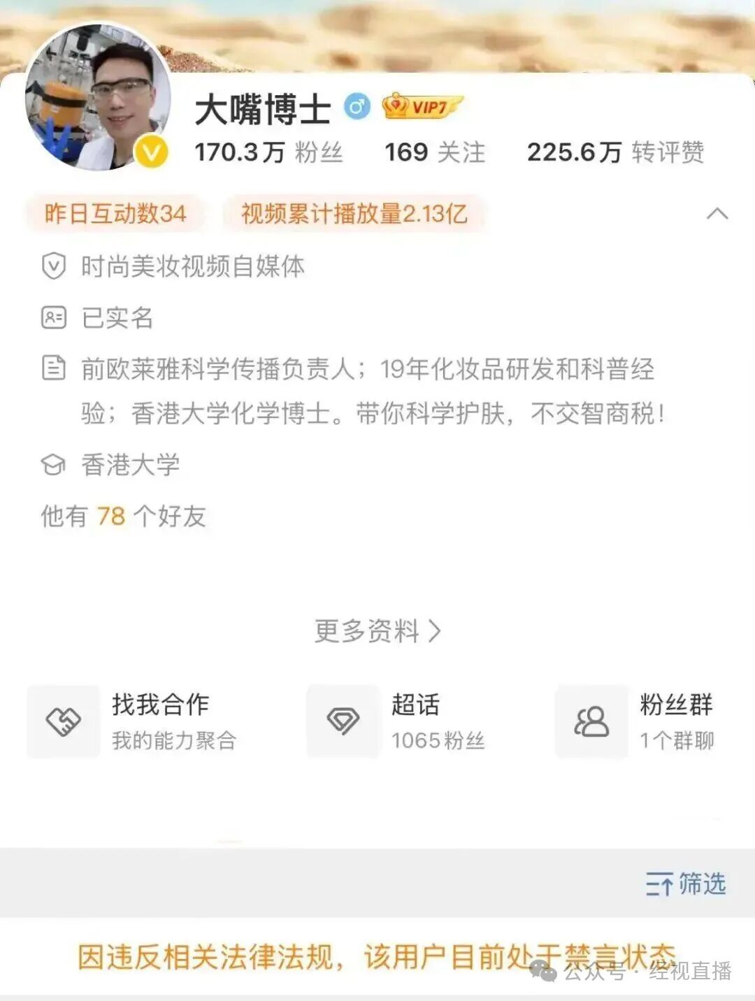 通报中提到,“大嘴博士”等账号发布炒作测评信息,影响市场竞争秩序。多个社交媒体账号“大嘴博士”运营主体与某美妆产品企业存在商业利益关系。上述账号多次针对同领域竞争对手产品发布炒作没有法律效力的测评信息,误导消费者,干扰正常市场秩序。涉及的账号已被依法依约采取禁言措施。