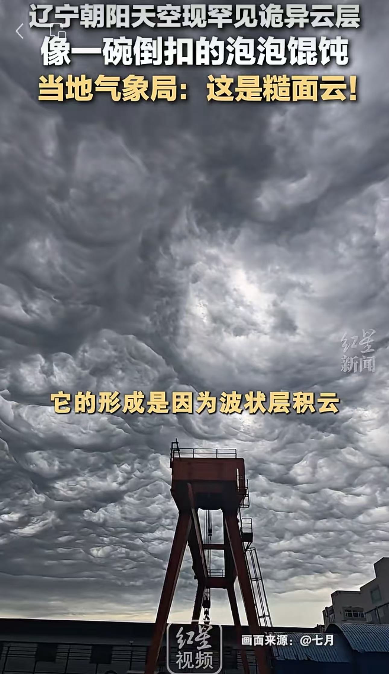 9月15日,辽宁省朝阳市多名网友拍到天空出现诡异云层,像一碗倒扣的泡泡馄饨,朝阳市气象局表示,这是糙面云。