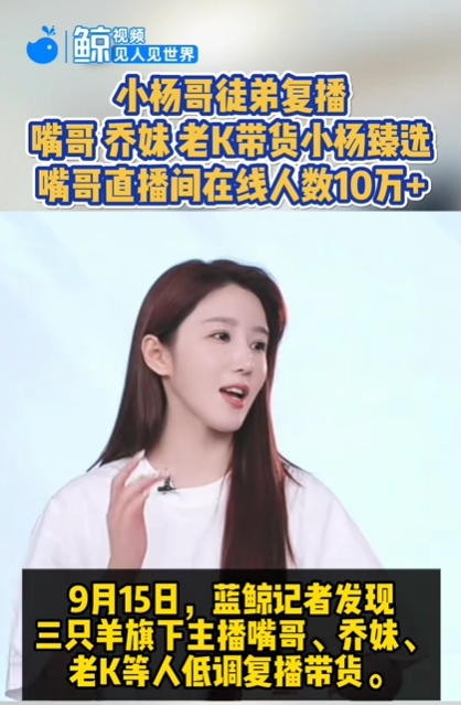 9月15日晚,“三只羊”旗下乔妹、老K、嘴哥等多名主播复播。其中,嘴哥直播间人气火爆,在线人数超10万。