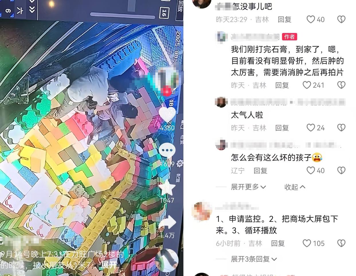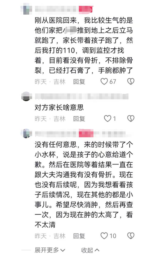事后,女孩家长发了视频并配文称:“刚从医院回来,比较生气的是他们家孩子把我家孩子推到地上之后,家长带着孩子跑了。我们打的110,调到监控才找着(肇事者)。(孩子)目前看没有骨折,不排除骨裂,已经打石膏了,手腕都肿了。”