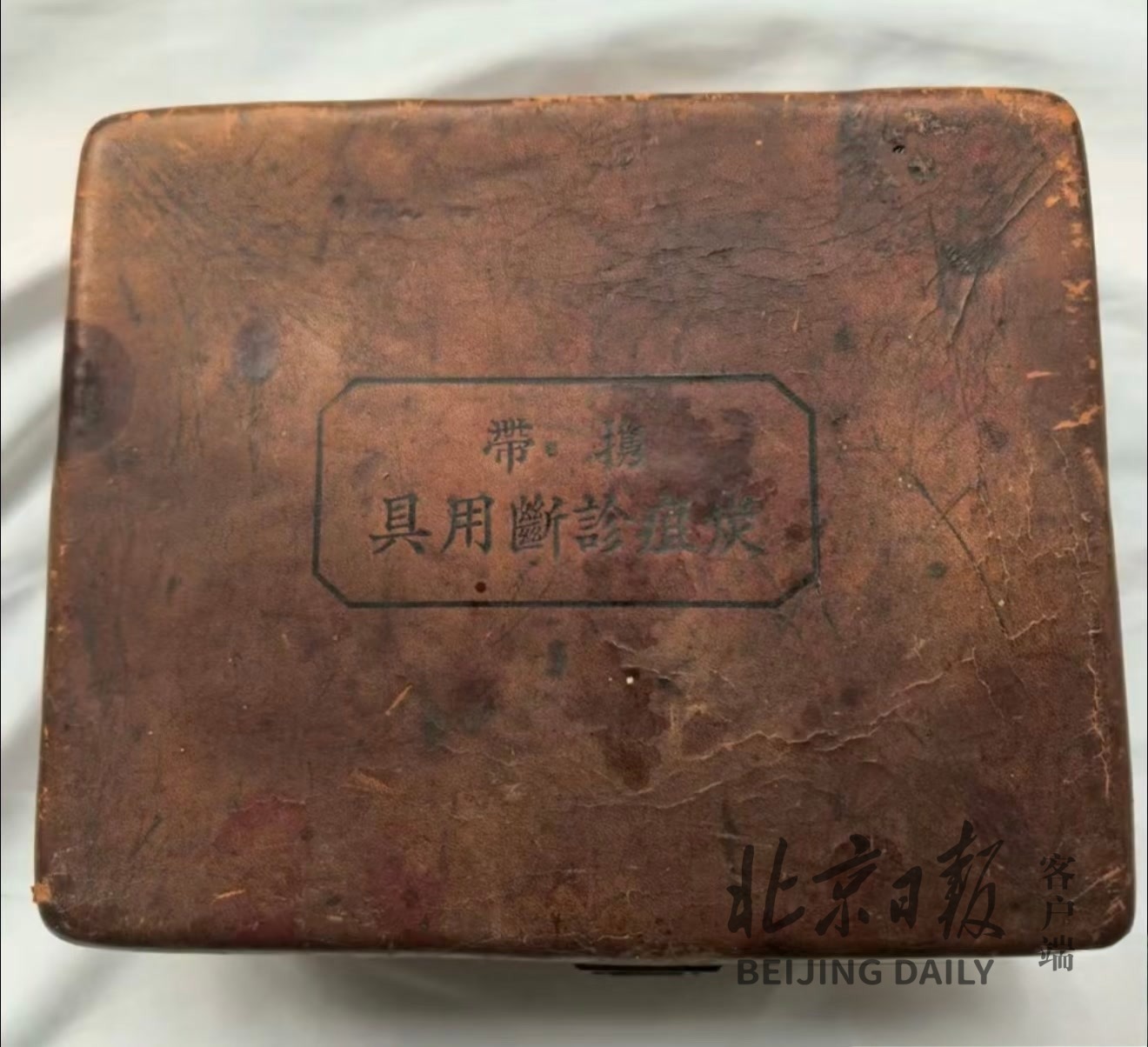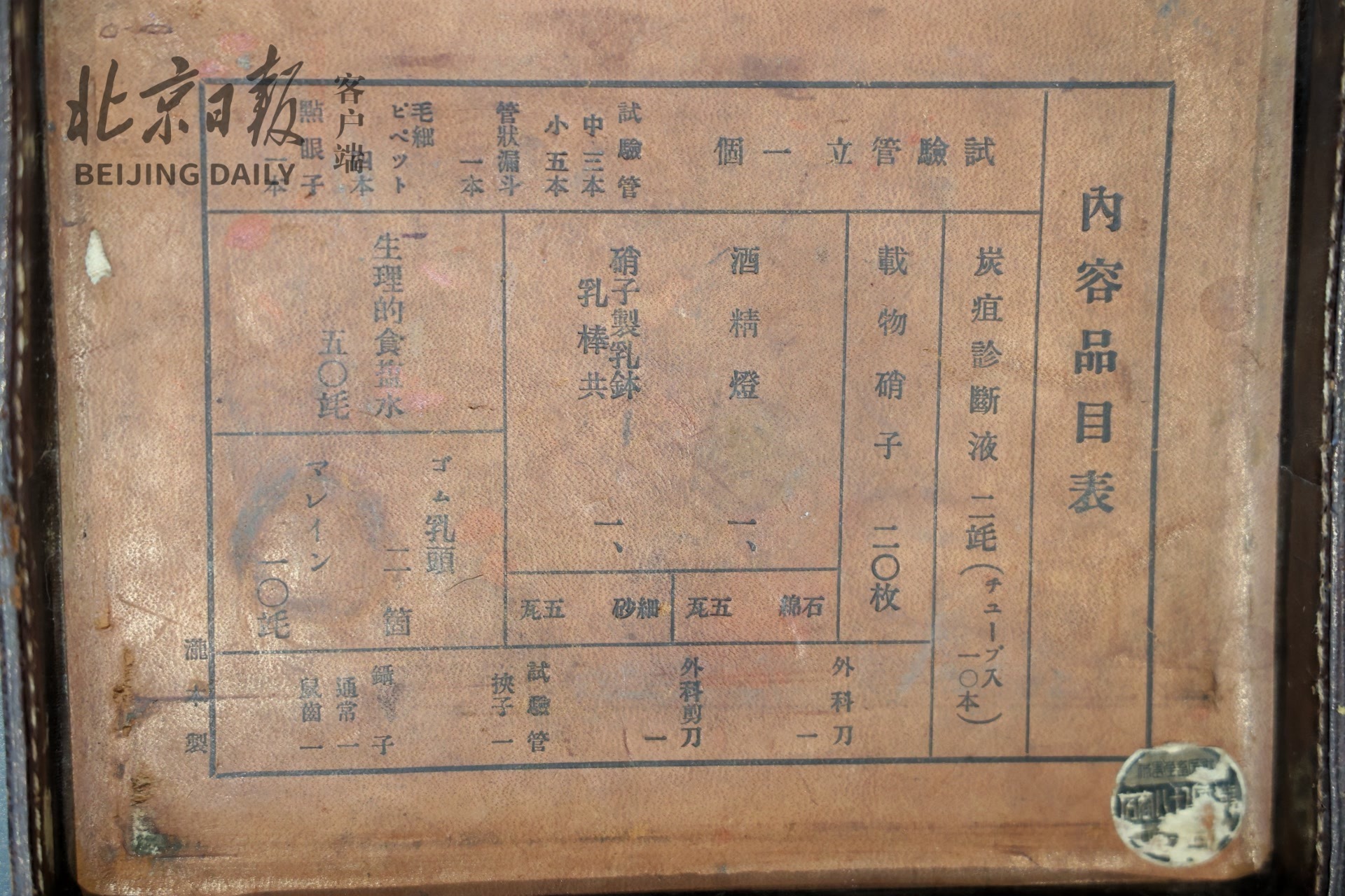 当侯冈和父亲仔细研究这只箱子时,一连串关键信息浮出水面:箱子是牛皮的,带有手工缝线,使用锁扣开关,正面赫然印着“携带炭疽診斷用具”。打开后,可见箱盖内侧印着很多文字,显示“炭疽診斷液”“試驗管”“鼠齒”等字样;右下角还有一枚残破的圆形贴纸,还能辨认出“獸醫畜産器械”几个字,但下面“XX八十八商店”的字样就模糊不清了。