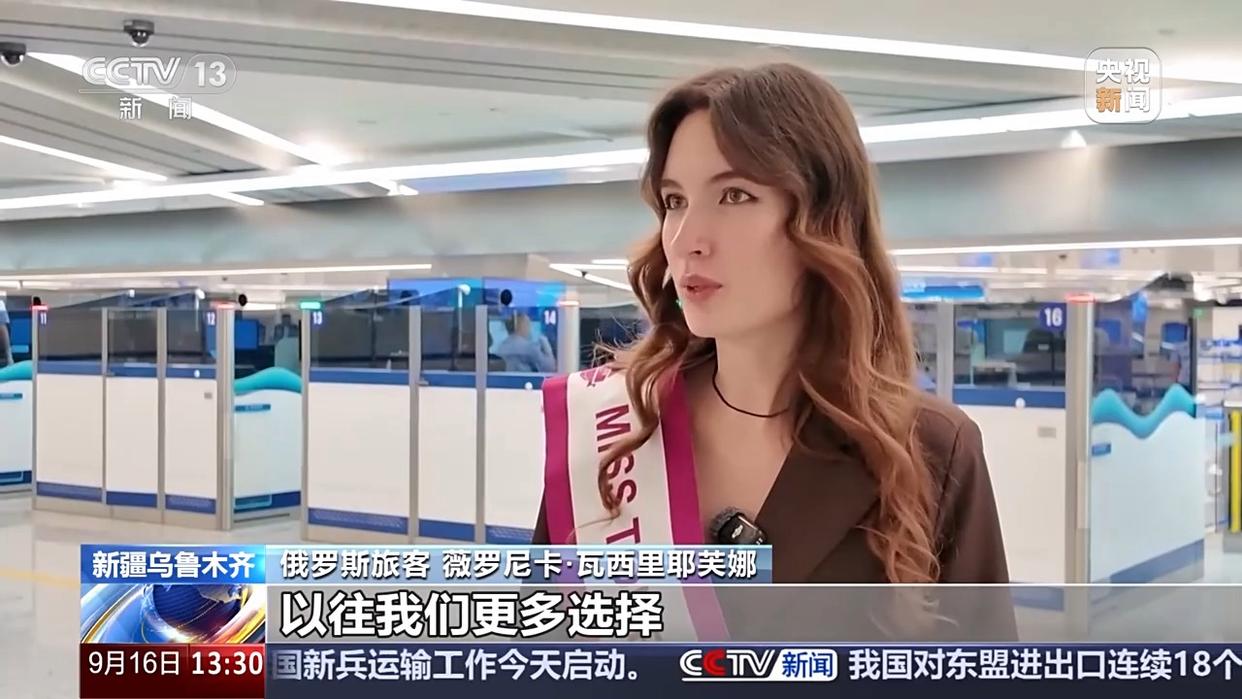 俄罗斯旅客 薇罗尼卡·瓦西里耶芙娜:我这次是来参加选美比赛,今天享受了免签政策,通关非常便捷,以往我们更多选择去有240小时过境免签的旅游城市游玩,比如三亚,免签政策试行后,我们可以选择来新疆旅游,选择面更广。