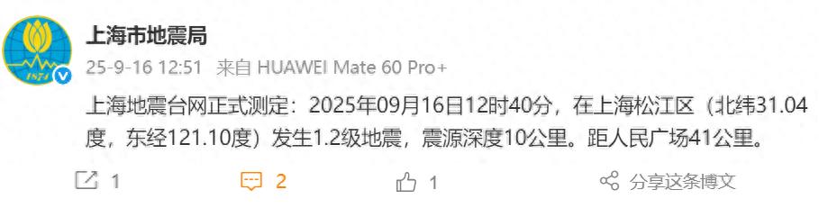 上海地震台网正式测定:2025年09月16日12时40分,在上海松江区(北纬31.04度,东经121.10度)发生1.2级地震,震源深度10公里。距人民广场41公里。