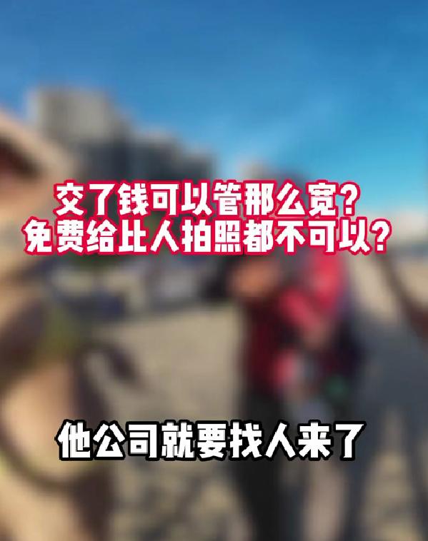 视频中,当事人询问,“哪家公司的?”对方回复,“你管我哪家公司的。” 当事人称,自己觉得该女子漂亮,免费为其拍照,不收费。但有人回复称,“这边(沙滩)是我们公司承包的。” 当事人再次强调自己不收费。