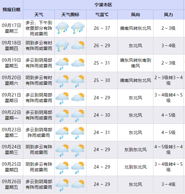 宁波市气象台表示,后天我市最高气温将显著下降至29℃左右,天气转为阴到多云有时有阵雨或雷雨。9月19日起云系较多,局部仍可能有阵雨。