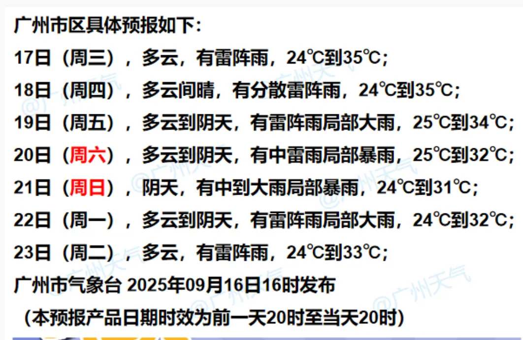 广州市气象台预计,9月17日—19日广州高温炎热天气持续,午后至傍晚有雷阵雨,气温24~35℃。9月20日—21日受热带系统影响,有一次明显风雨过程。