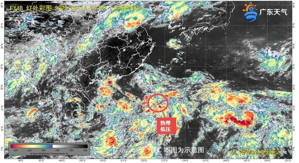 据@广东天气:原位于菲律宾以东洋面的热带扰动已于9月16日14时加强为热带低压,14时其中心位于北纬15.3度、东经123.7度,距离菲律宾马尼拉东偏北方向约300公里,中心附近最大风力7级(15米/秒),中心最低气压1005百帕。