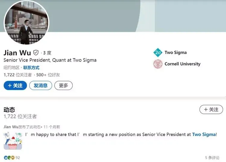 名校毕业的吴舰曾在美国知名做市商Citadel(城堡投资)实习,于2018年4月加入顶尖量化对冲基金Two Sigma,从量化研究员做起,三年时间不到就升任Two Sigma量化研究部的副总裁,2023年1月,工作不到五年的吴舰被提拔为高级副总裁。