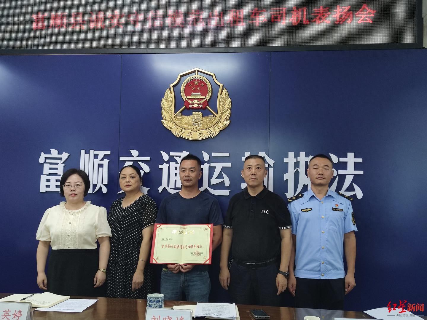 周伟(中)获评“诚实守信模范出租车司机” 红星新闻记者 袁伟 摄