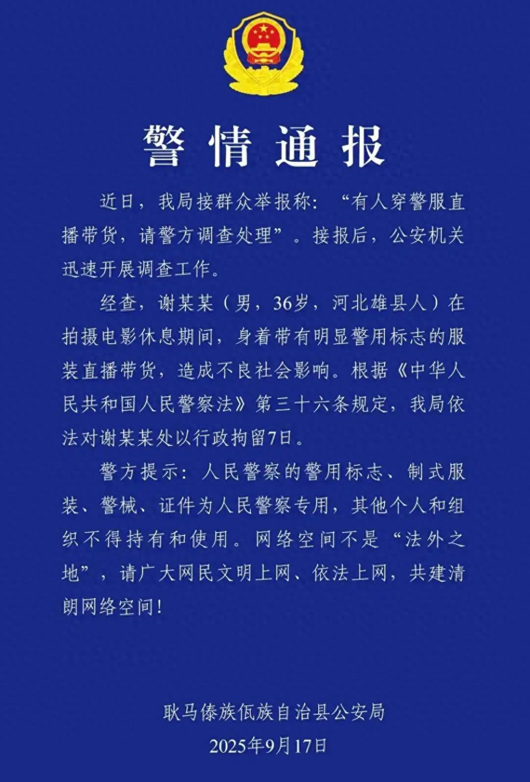 经查,谢某某(男,36岁,河北雄县人)在拍摄电影休息期间,身着带有明显警用标志的服装直播带货,造成不良社会影响。根据《中华人民共和国人民警察法》第三十六条规定,依法对谢某某处以行政拘留7日。
