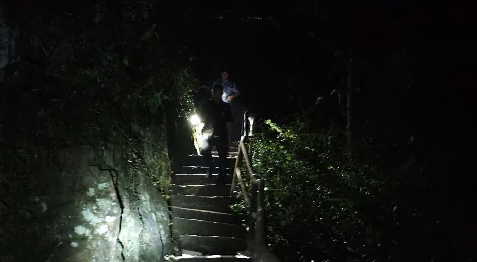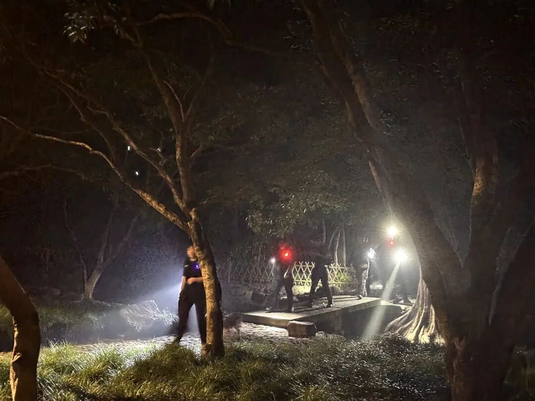 但他们依旧不懈搜寻,密切排查每一处角落,呼喊着失踪男子的名字,一束束手电光在山林间不断闪烁。