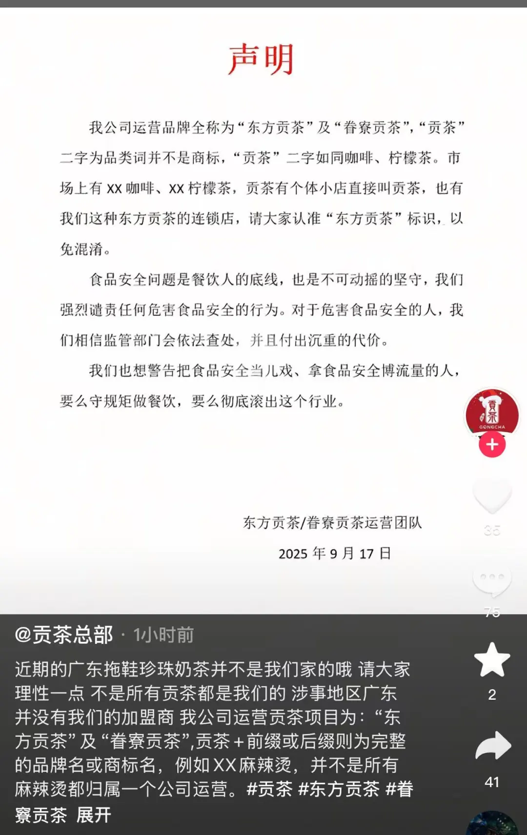 9月18日,贡茶总部发文称:近期的广东拖鞋珍珠奶茶并不是我们家的,请大家理性一点,不是所有贡茶都是我们的,涉事地区广东并没有我们的加盟商,我公司运营贡茶项目为:“东方贡茶”及“眷寮贡茶”,贡茶+前缀或后缀则为完整的品牌名或商标名,例如XX麻辣烫,并不是所有麻辣烫都归属一个公司运营。