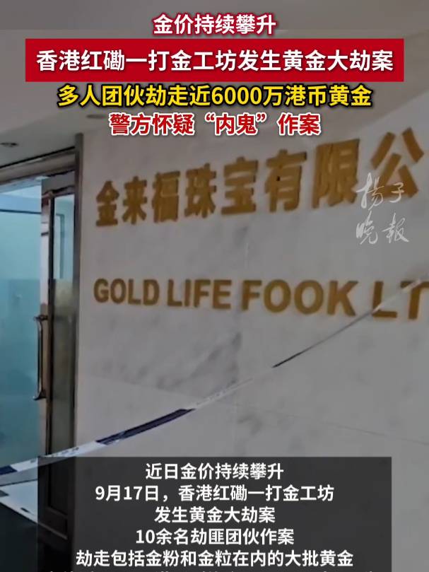消息指出,案发时,报案人正与5名友人在工场内吃饭及休息,其间没有留意大门是否锁上。突然间,约10名男子闯入抢劫。他们进入工场专门存放黄金的房间,掠走了65公斤的金条、金砖及金粉,总值约5800万港币(约合人民币5302万元)。此外,窃贼还在工场内偷走了约3万元港币现金(约合人民币2.7万元)。