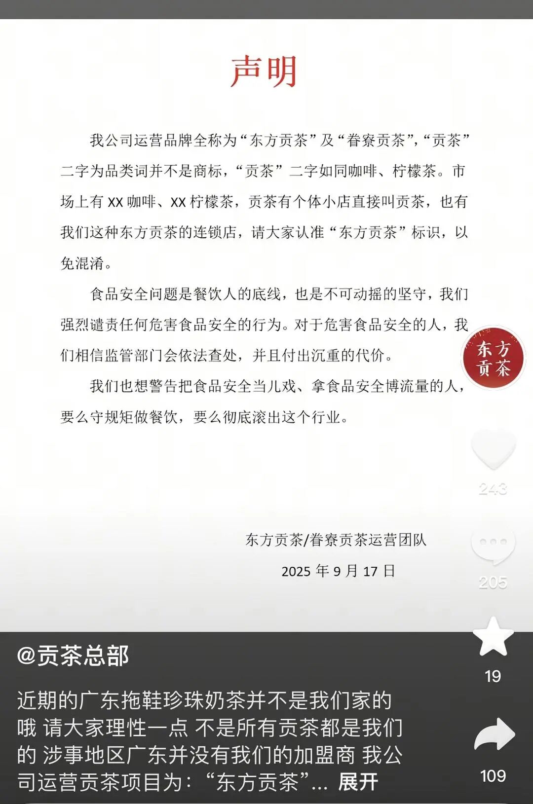 其声明解释称:“我公司运营品牌全称为‘东方贡茶’及‘眷寮贡茶’,‘贡茶’二字为品类词并不是商标,‘贡茶’二字如同咖啡、柠檬茶。市场上有xx咖啡、xx柠檬茶,贡茶有个体小店直接叫贡茶,也有我们这种东方贡茶的连锁店,请大家认准‘东方贡茶’标识,以免混淆。”