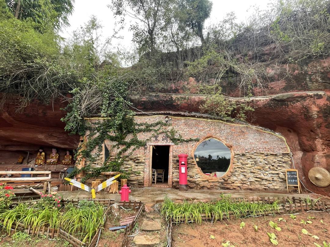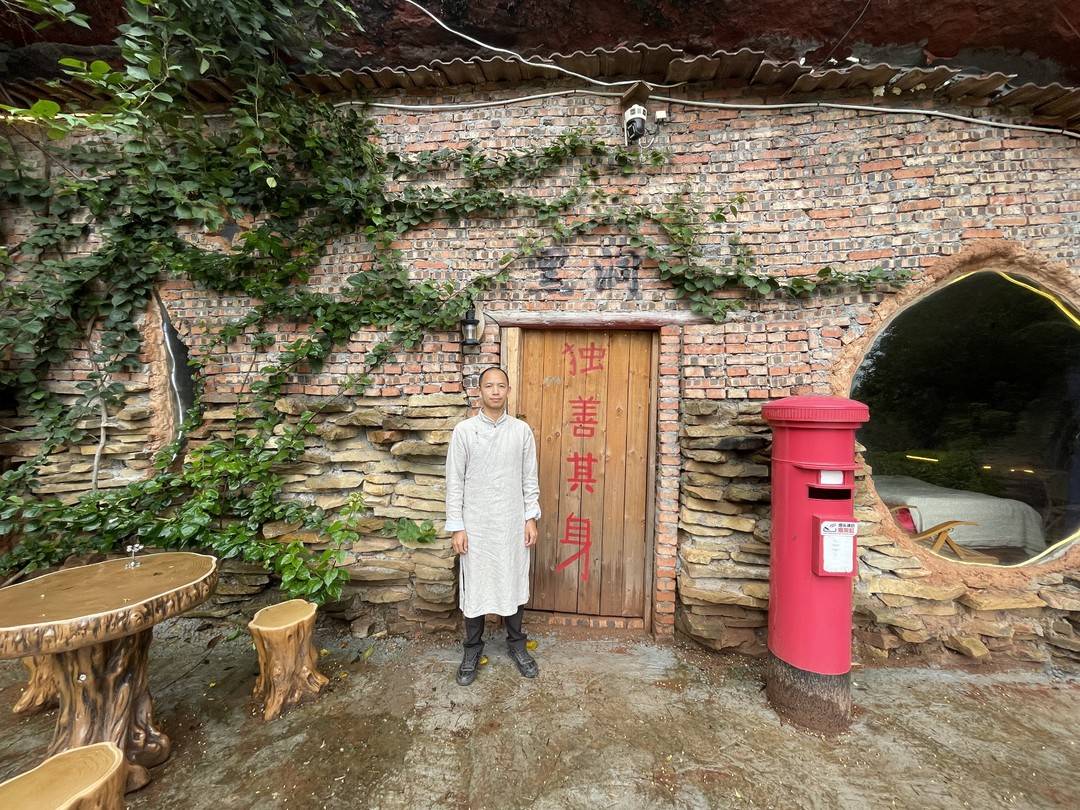封面新闻记者在现场看到,几间“房间”仅仅是用红砖墙隔开,“天花板”是崖壁,几扇“窗户”砌成太阳、月亮、星星的造型,正门上方写有“黑洞”两字;一扇木门虚掩,上书“独善其身”四个红字,格外惹眼。