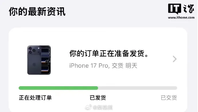 在苹果官网 Apple Store 购买的 iPhone 17 / Pro 系列预售新机现已开始发货,最早明天送达。
